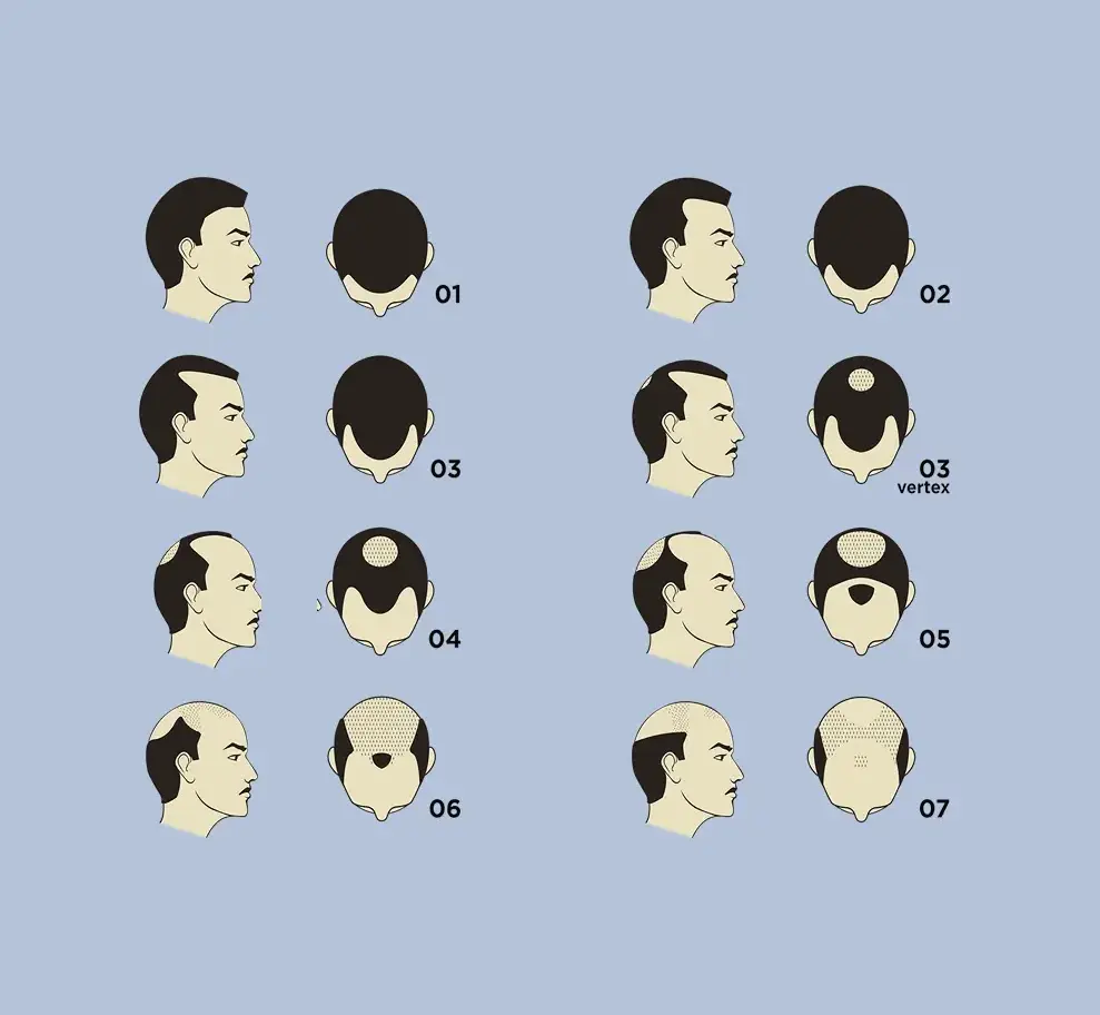 Öndeki ve tepedeki saçsız alanlar genişlemiştir. İki bölge arasındaki saçlı şerit neredeyse yok denecek kadar incelmiş yada seyrelmiştir. (7000 saç kökü) ekilebilir.